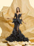 Впечатляваща черна рокля тип русалка с корсет и големи твърди форми като листа отпред, извиващи се в пеплуми на талията.