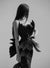 Впечатляваща черна рокля тип русалка с корсет и големи твърди форми като листа отпред, извиващи се в пеплуми...