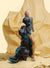 Украсата е от скулптурни форми от фризе в черно, сиво и кралскосиньо, оформени като ветрила отдясно и големи харбали в долната част, с предна цепка.