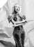 Сребристата сърмена дантела е ръчно нашита по горната част, презрамките, ханша и вертикално надолу, следвайки извивките на тялото.