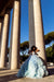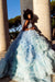 A breathtaking ball gown featuring a voluminous skirt crafted from layers of fine Italian tulle in shades of light blue and champagne.