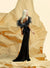 A refined black velvet mermaid gown designed with a clean, elongated silhouette.The high neckline features a front panel...
